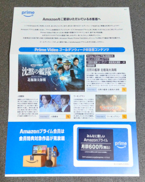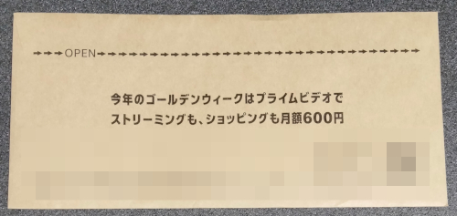 日記 Amazon Prime(アマプラ)からの封筒 2026年4月25日 2026年4月25日 エフ Facebook postはてブLINEPocketFeedly 当サイトはアフィリエイト広告を利用しています。 この記事の目次1 アマゾンよりDM封書が届く2 Amazon Prime(アマプラ)のPR?3 なんかカードがあるっ!4 カードをゆっくりはがしてみた アマゾンよりDM封書が届く アマゾンから封筒が届きました。 「君のこころが観たいもの。」とな? Amazon Prime(アマプラ)のPR? なんかカードがあるっ! カードをゆっくりはがしてみた なにか特典?なになに!? と思いながらカードをはがしてみました。 結果 ・ ・ ・ 特典のようなものは見当たらず。 単なる宣伝的なDMってことか。 Facebook postはてブLINEPocketFeedly