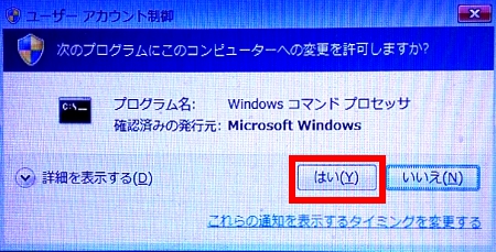 ユーザーアカウント制御窓が表示されるので、「はい(Y)」を押す
