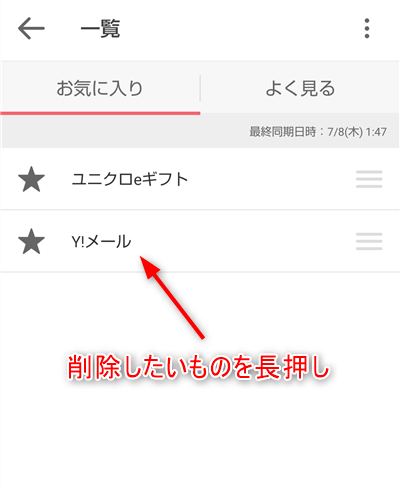 スマホ ヤフーアプリ お気に入りの削除方法 2021年7月8日 2021年7月8日 エフ Facebook postはてブLINEPocketFeedly 当サイトはアフィリエイト広告を利用しています。 Yahoo!JAPANのAndroidアプリ。 お気に入りのページを見ていて、登録したのを削除するやり方がわからずに、しばらくジタバタしてしまいました。 しかし、いろいろ触っていたらわかりました。 こうです↓ Facebook postはてブLINEPocketFeedly